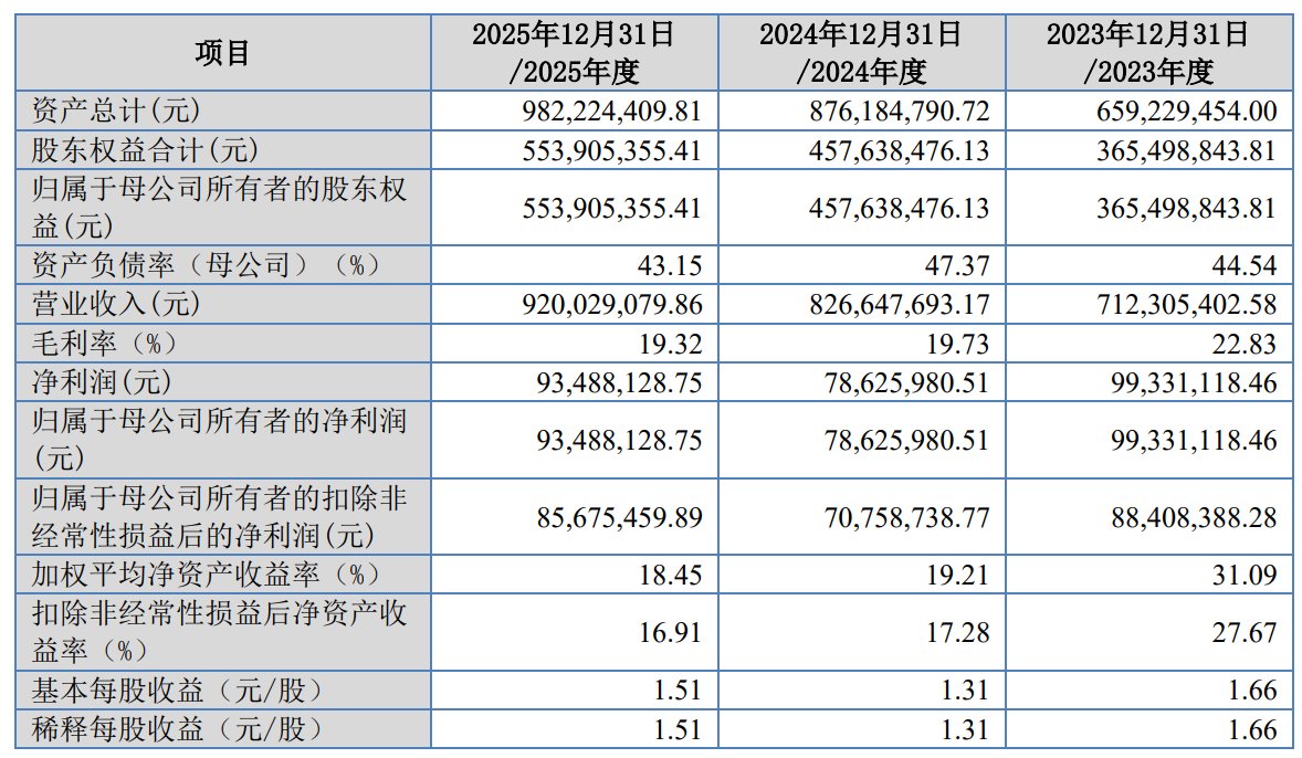 财务方面,于2023年、2024年及2025年,公司实现营业收入分别约为7.12亿元、8.27亿元、9.20亿元人民币;同期净利润分别约为9933.11万元、7862.60万元、9348.81万元人民币。