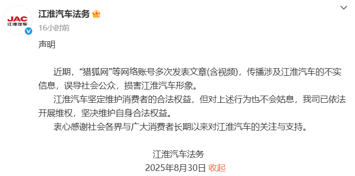 8月30日,“江淮汽车法务”官方微博发布声明称, 近期,“猎狐网”等网络账号多次发表文章(含视频),传播涉及江淮汽车的不实信息,误导社会公众,损害江淮汽车形象。
