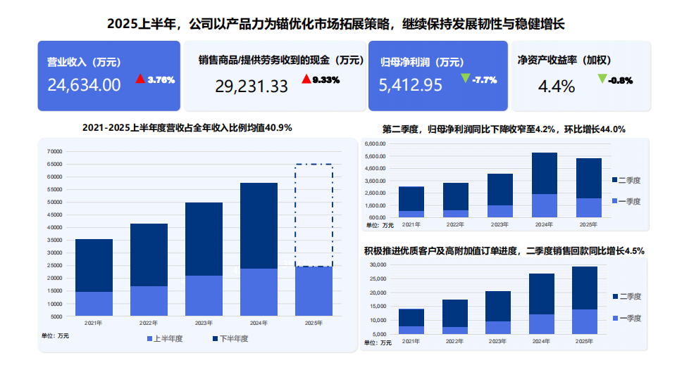 全球市场布局上,上半年,国际市场营收12749.51万元,同比增长3.2%。公司加速调整运营策略,新加坡运营中心承接国际订单占比增至29.3%,6月更是达到56.5%,有效分散风险。国内市场营收11884.49万元,同比增长4.4%,其中第二季度环比增长35.4%,下游行业景气度回升带动订单稳步增长。