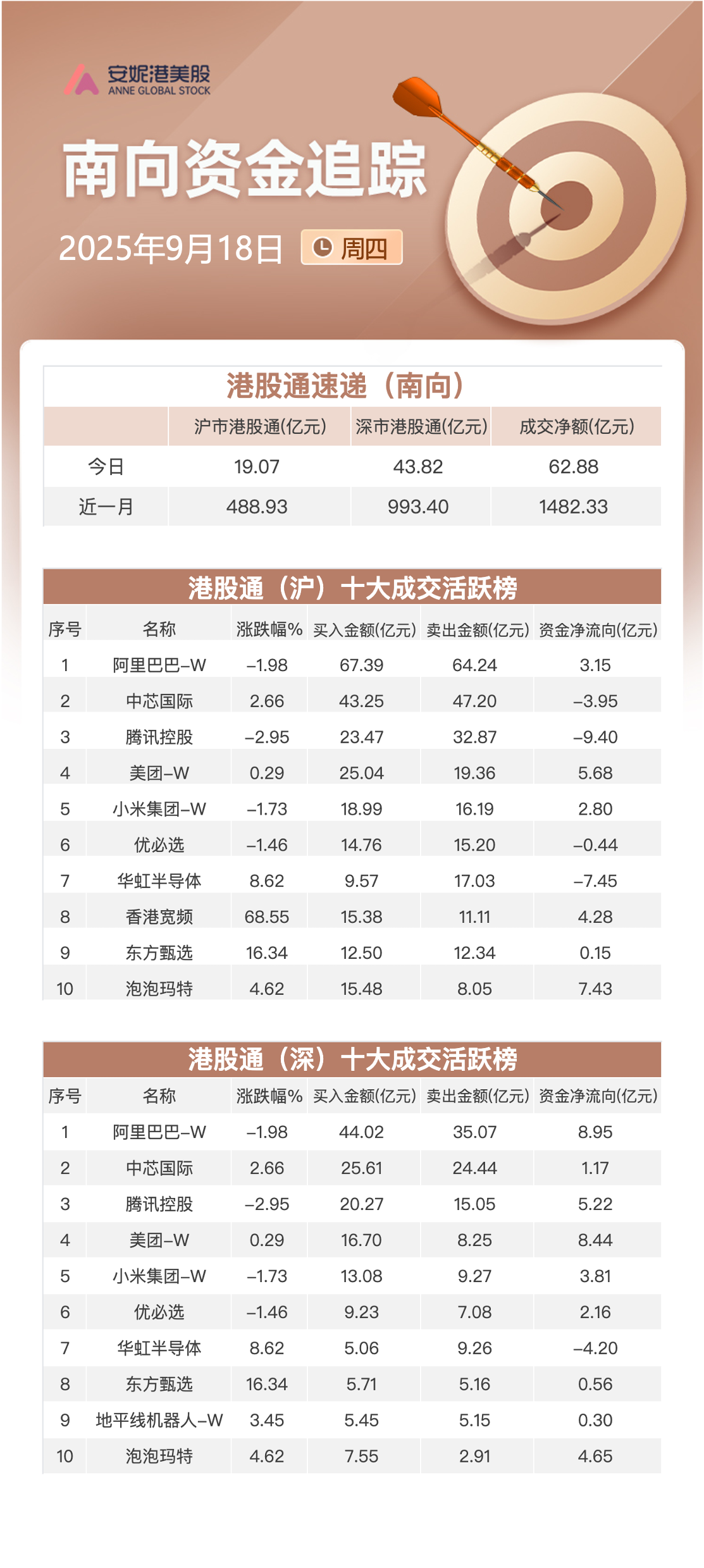 今日恒指冲高后回落波动加剧,南向资金继续流入。全天净买入约62.88亿港元。其中,沪港股通净买入约19.07亿港元,深港股通净买入约43.82亿港元。