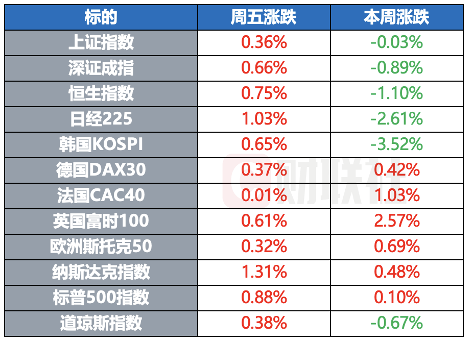 全球主要指数周五全线收涨,美股三大指数连续第二个交易日集体收涨,纳指涨超1%。