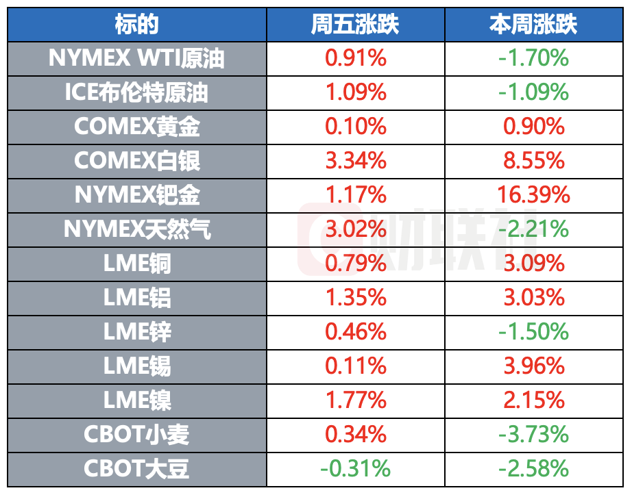 COMEX黄金期货收涨0.1%,报4368.7美元/盎司,本周累计上涨0.9%;COMEX白银期货收涨3.34%,报67.395美元/盎司,本周累计上涨8.55%。
