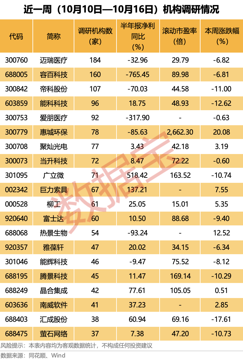 从市场表现来看,近一周机构调研股平均下跌近4%,惠城环保、骄成超声、热景生物、梅雁吉祥等个股均逆市涨逾10%。