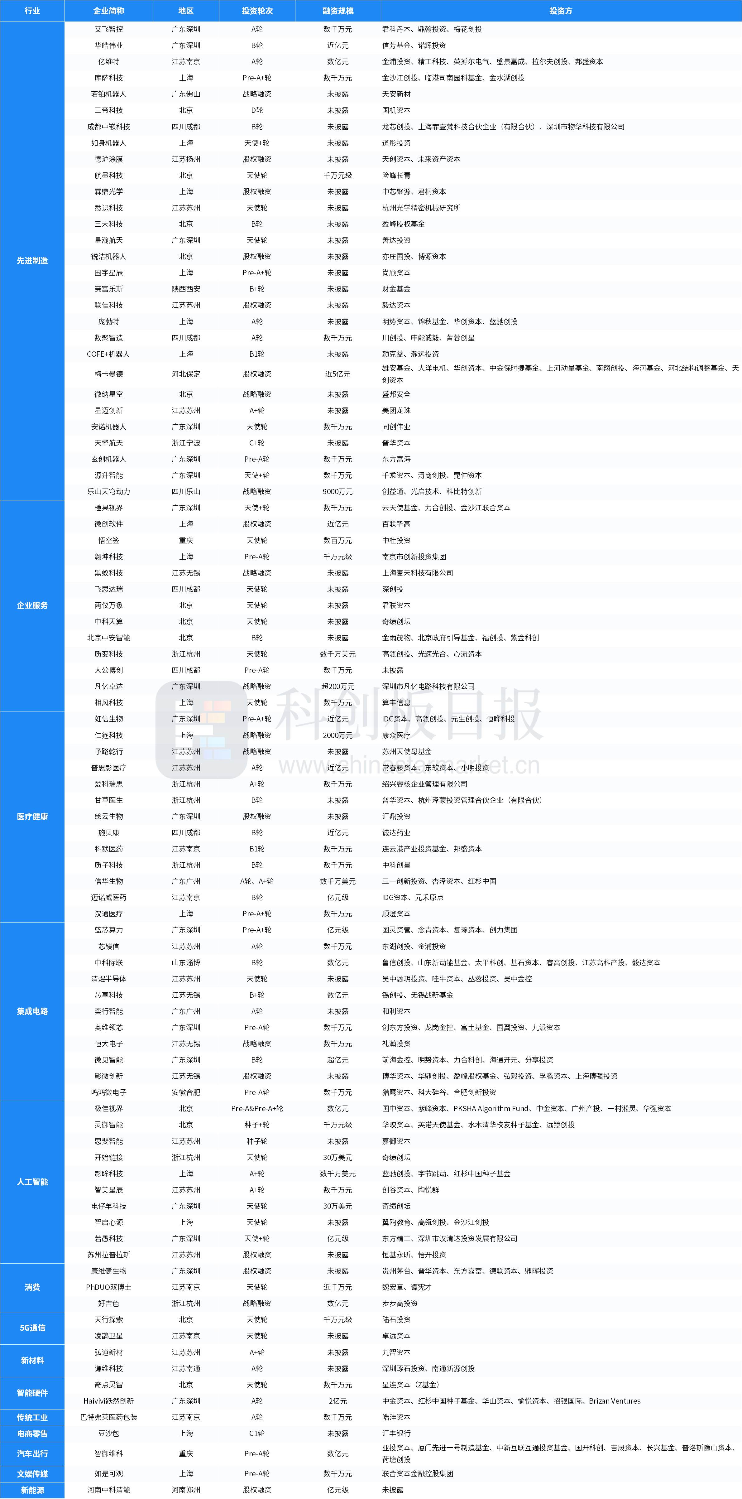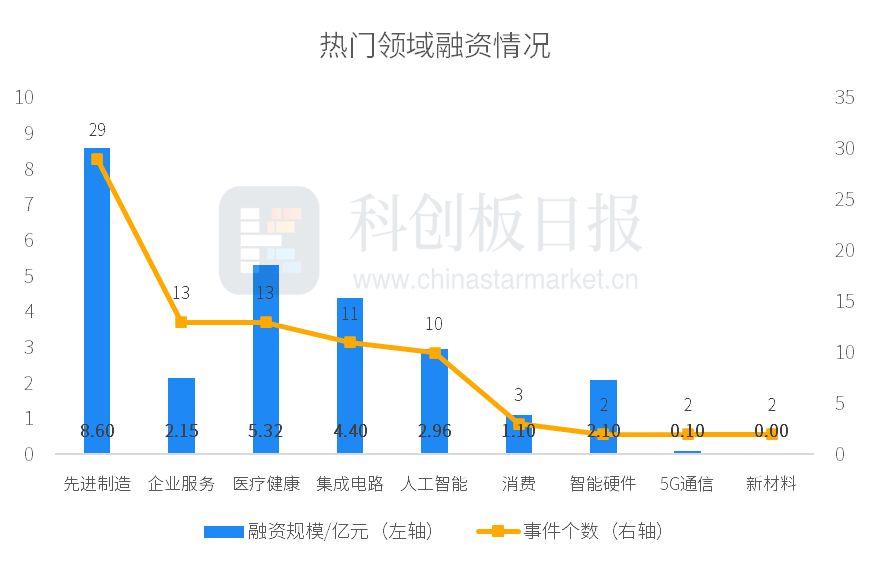 从投资事件数量来看,本周先进制造、医疗健康、企业服务、集成电路、人工智能等领域较活跃;从融资总额来看,先进制造披露的融资总额最多,约8.60亿元。梅卡曼德完成由雄安基金、大洋电机、华创资本、中金保时捷基金、上河动量基金、南翔创投、海河基金、河北结构调整基金、天创资本等参与的近5亿元新一轮融资,为本周披露金额最高的投资事件。