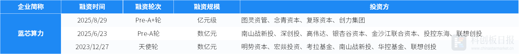 近日,公司宣布完成亿元级新一轮融资,由图灵资管、念青资本、复琢资本和上市公司创力集团共同参与。同时,蓝芯算力数亿元的下一轮融资也将于近期交割。