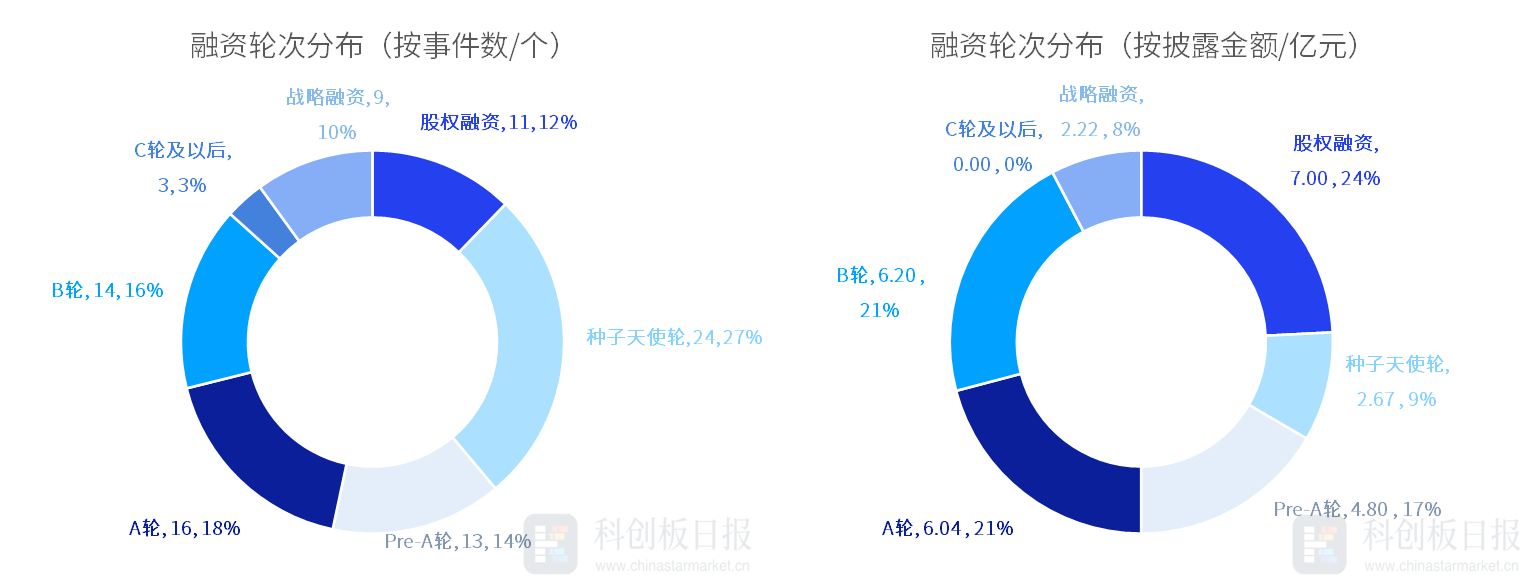 从投资轮次来看,除股权融资外,本周种子天使轮融资事件数最多,发生24起,占比约27%;其次是A轮,发生16起,占比约18%。从各轮次获投金额来看,股权融资披露的融资总额最高,约7亿元;其次是B轮,约6.2亿元。