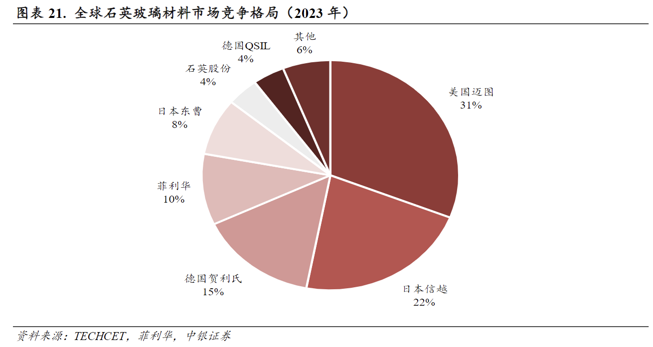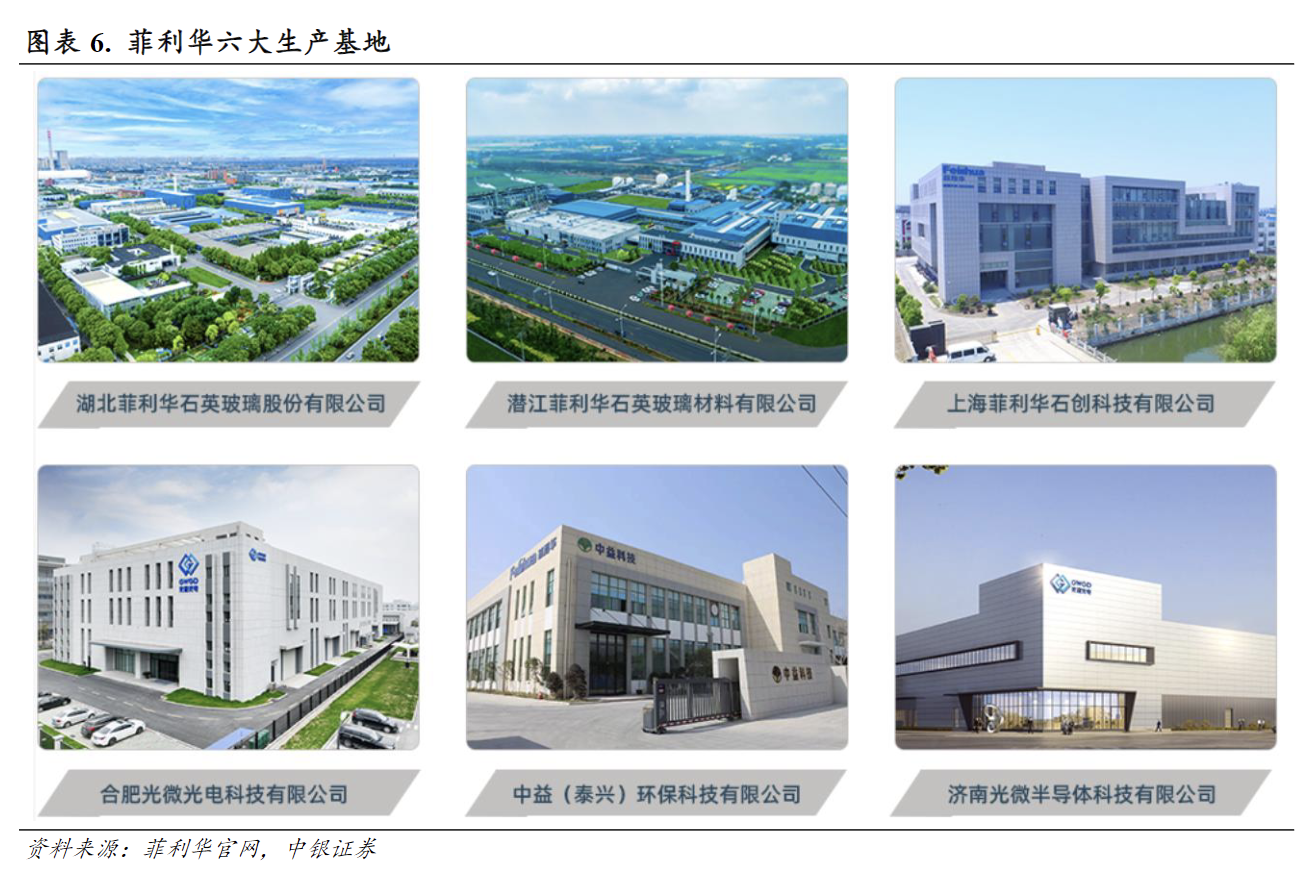 半导体夯实重要增长极,光学材料赋能大国重器。半导体石英制品具有高纯度、耐高温的特点。根据QYResearch数据,2024~2031年全球半导体石英制品市场规模将从32.26亿美元增长至73.21亿美元。根据弘燊石英大会数据,中国半导体石英制品国产化率不足10%,国产设备厂和Fab厂都在积极推进国产化。菲利华石英玻璃精密加工能力在国内处于领先水平,公司半导体石英材料或部件已经通过AMAT、Lam、TEL、北方华创、中微公司的认证。根据中国粉体网报道,熔融石英是光刻机光学系统的重要材料之一。菲利华开发的无氯合成石英、高均匀性合成石英、低羟基和少羟基合成石英是紫外光学应用的优选材料。同时菲利华通过子公司济南光微积极布局光掩膜板精密加工产能,填补了中国在该领域的空白。