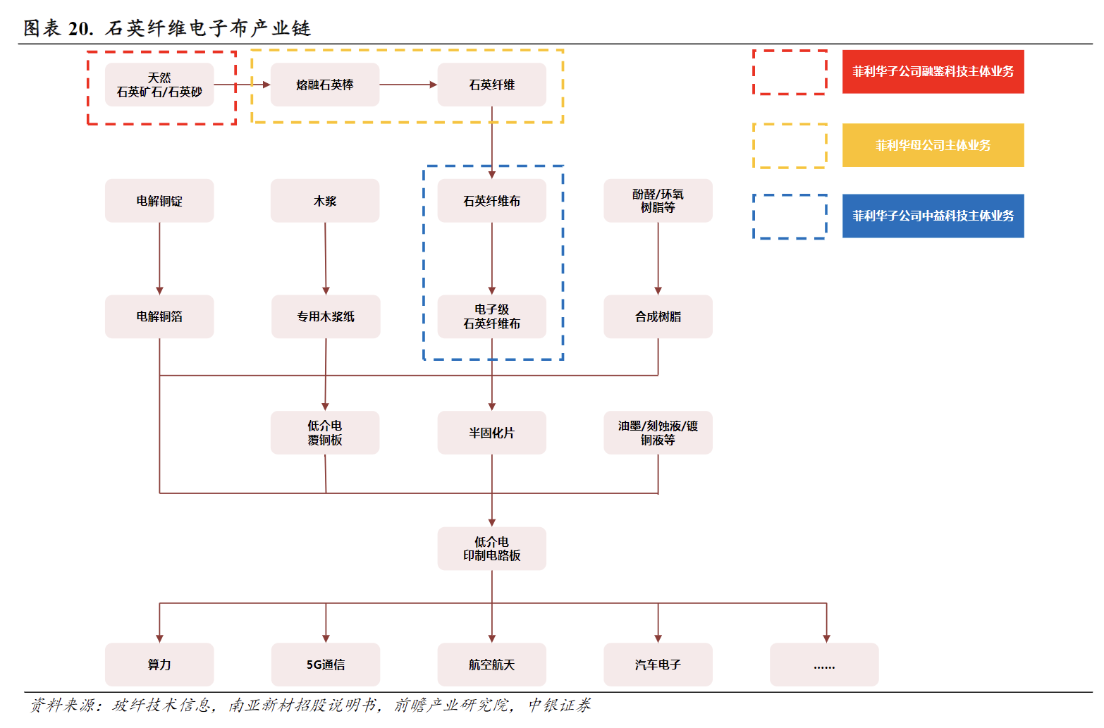 1.石英纤维电子布业务:先进计算、5G通信、汽车电子、航空航天等行业的发展对PCB的信号传输速率、稳定性、完整性需求日益增长。低介电电子布可以降低PCB信号传输延迟和能量损失,是算力时代PCB的核心材料之一。据PCB网城报道,英伟达GB200因为信号传输速率较高而采用M8材料和20层HDI的设计以降低信号传输损耗。根据快科技报道,英伟达RubinGPU将采用台积电N3P制程,支持8层HBM4,并搭载NVLink6Switch,可以提供3600GB/s的连接速度。考虑到Rubin相较于Blackwell进行了架构升级,预计RubinGPU适配的PCB或将升级至M9材料,并对低介电电子布性能提出更高的要求。根据菲利华《石英纤维的性能及应用》,石英纤维的介电损耗在1MHz/10GHz下分别达到0.0001/0.0002,低于传统的D玻纤和E玻纤。石英纤维有望成为高频高速覆铜板低介电电子布的核心材料之一。菲利华是全球少数可以量产石英玻璃纤维的厂商之一,公司拥有石英砂、石英纤维、石英纤维电子布的全产业链能力。根据弘燊石英大会报道,菲利华子公司中益科技已经在石英纤维电子布领域深耕九年,其第二代超低损耗石英电子布采用棒拉法拉丝工艺,直接对标日本信越化学等国际巨头。