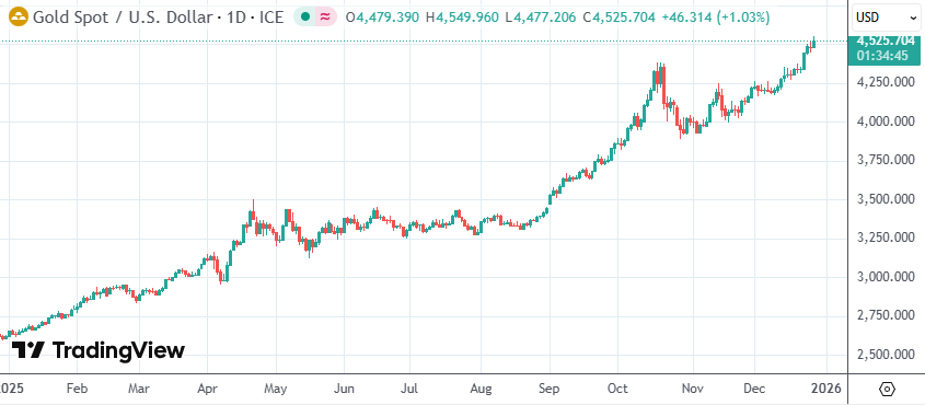 具体行情显示,现货黄金价格一度升至每盎司4549.95美元的新高。截至发稿,现货金价报每盎司4527美元,日内涨幅超1%,年初至今累计上涨超72%。