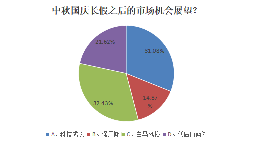 相关问卷调查结果显示,在上周A股短期震荡回暖的背景下,超六成私募明确表示,相对看好中秋国庆长假之后的A股短中期表现。其中,在节后最看好的结构性方向方面,“白马股”排名第一。此外,私募机构在长假持股、持币的抉择上,明显更倾向于“重仓持股”。