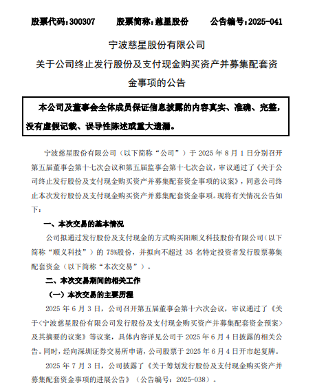8月1日晚,慈星股份(300307)披露《关于公司终止发行股份及支付现金购买资产并募集配套资金事项的公告》称,公司原计划通过发行股份及支付现金的方式购买沈阳顺义科技股份有限公司的75%股份,并拟向不超过35名特定投资者发行股票募集配套资金。但经多轮协商和谈判后,公司与本次交易的部分交易对方就部分商业条款未达成一致意见,为维护公司全体股东长期利益,公司经审慎考虑,决定终止本次重组事项。