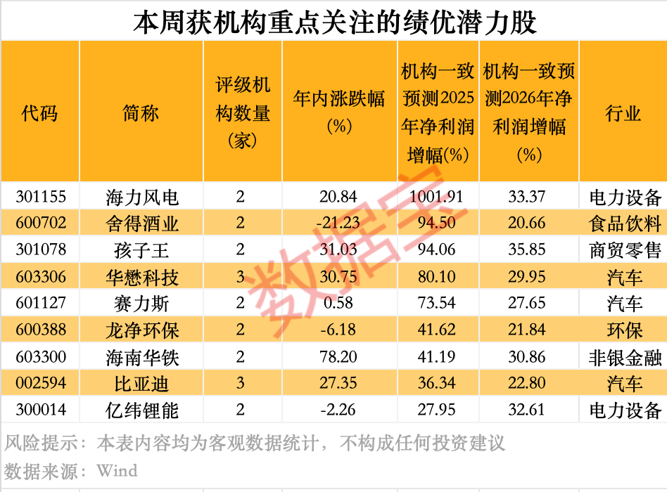 进一步统计,本周获机构给予“买入型”评级的个股,最显著的特征为业绩成长性优质。本周获机构重点关注的23只个股中,机构一致预测2025年、2026年净利润增幅有望持续超过20%的个股仅有9只,主要分布在汽车、电力设备、商贸零售、食品饮料等行业。