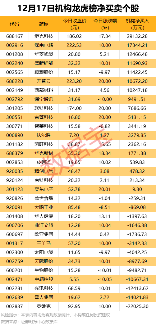 12月17日龙虎榜中机构席位资金净买入4.67亿元,其中,净买入的个股18只;净卖出的个股13只。其中炬光科技机构净买入近3亿元,深南电路、华菱线缆、盛新锂能、顺灏股份、开普云、西部材料机构净买入均超1亿元。