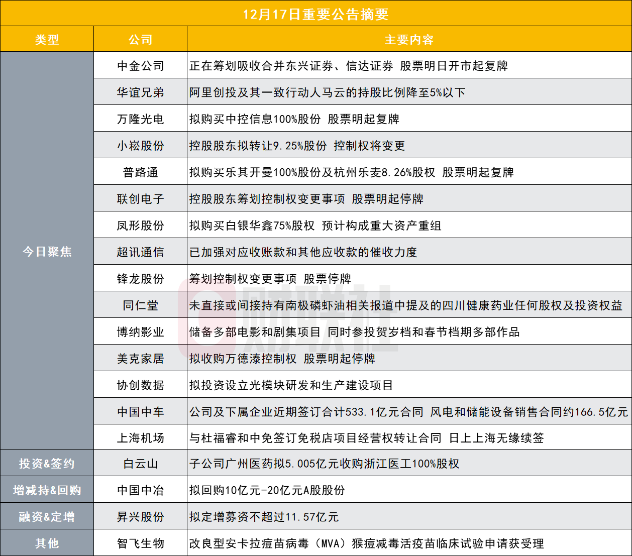 信达证券(601059.SH)公告称,公司于12月17日召开董事会,审议通过中金公司换股吸收合并东兴证券、信达证券预案,公司A股股票将于12月18日起复牌。本次交易方案尚需再次审议及股东会审议批准,并取得相应批准、核准、注册或同意后方可实施,存在不确定性。