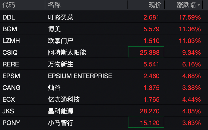 中概股纷纷飘红,纳斯达克中国金龙指数盘中一度涨超1%。中资光伏新能源、消费零售、半导体、化工股领涨。叮咚买菜涨超17%,阿特斯太阳能涨超9%,晶科能源涨超4%。