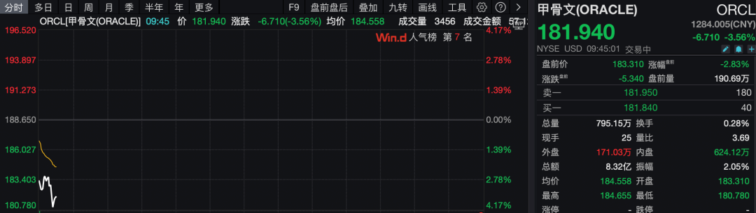 热门个股方面,甲骨文开盘大跌。据报道,甲骨文最大的数据中心合作伙伴Blue Owl Capital将不会为甲骨文下一个价值100亿美元的数据中心项目提供资金支持,因为这家软件巨头正面临日益增长的债务和人工智能支出方面的担忧。