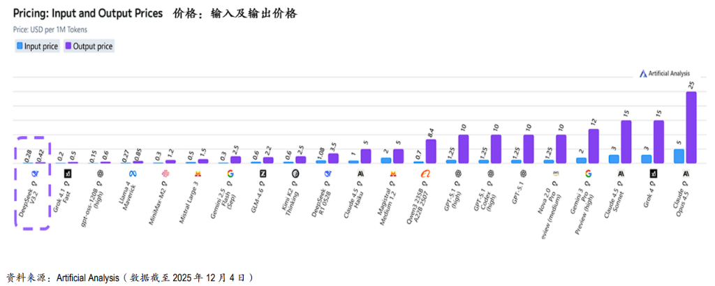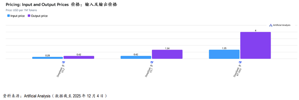 降幅对比:相比2025年9月发布的V3.1Reasoning(输入0.42/输出1.34美元),输出成本暴跌69%,输入成本降低33%。相比2025年1月的R1模型,价格优势更加呈指数级扩大。