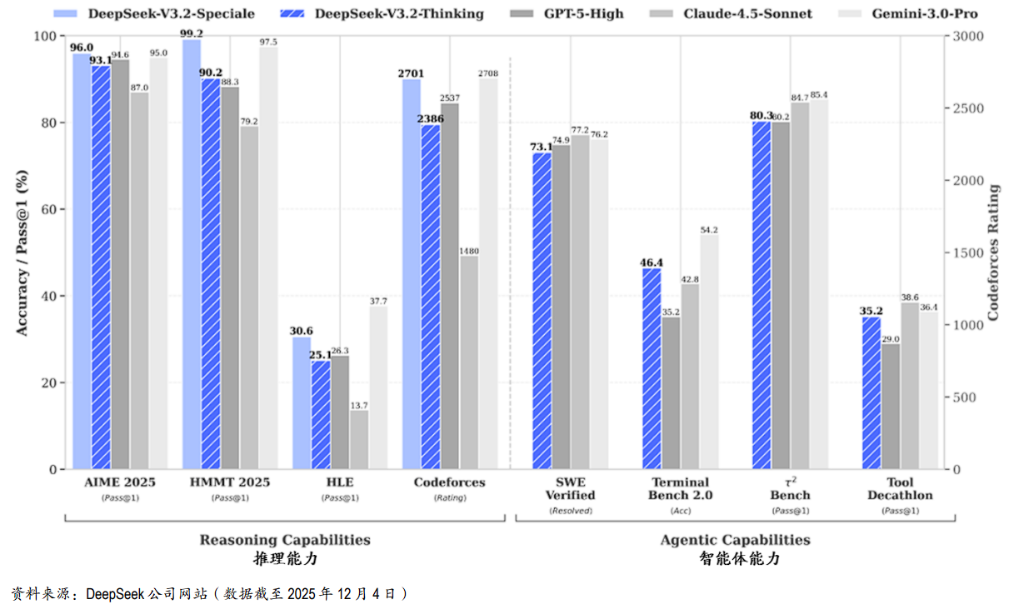 据华尔街见闻文章,12月1日,DeepSeek发布V3.2系列两款模型并开源。V3.2主打日常应用,推理能力达GPT-5水平,首次实现思考模式与工具调用融合;V3.2-Speciale专注极致推理,在IMO、CMO、ICPC、IOI四项国际竞赛中斩获金牌。