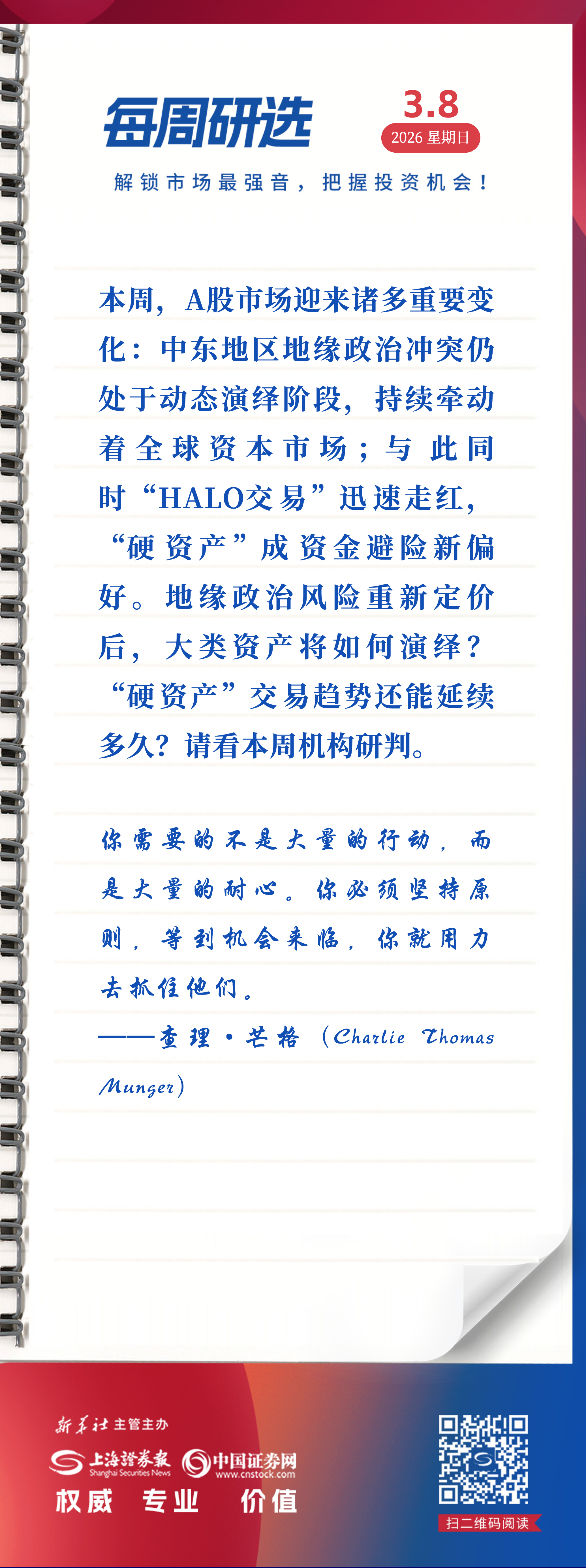 本周,A股市场迎来诸多重要变化:中东地区地缘政治冲突仍处于动态演绎阶段,持续牵动着全球资本市场;与此同时“HALO交易”迅速走红,“硬资产”成资金避险新偏好。地缘政治风险重新定价后,大类资产将如何演绎?“硬资产”交易趋势还能延续多久?请看本周机构研判。
