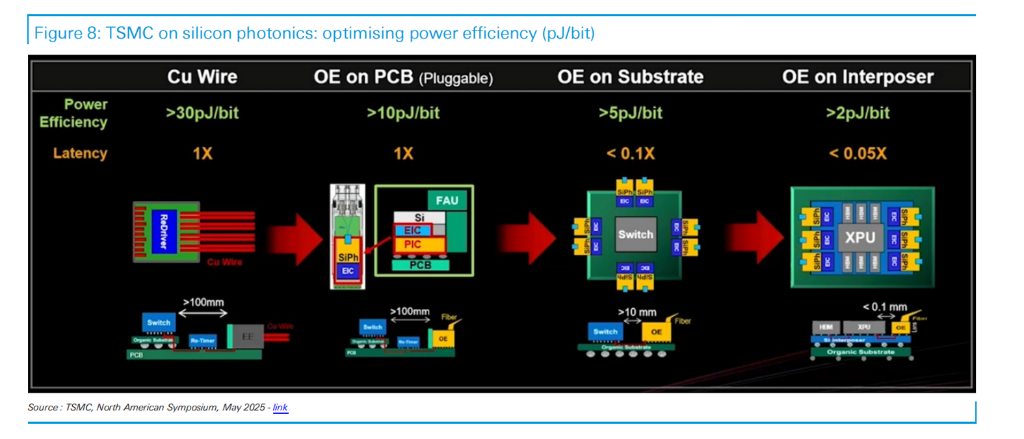 德银表示,AI数据中心的带宽需求爆炸式增长,推动光电子/光子学技术成为行业增长的核心引擎。当前多数AI数据中心采用以太网或InfiniBand搭配可插拔光模块,未来将逐步向高速可插拔光模块、线性可插拔光学(LPO)及共封装光学(CPO)演进,以实现更低功耗和延迟。
