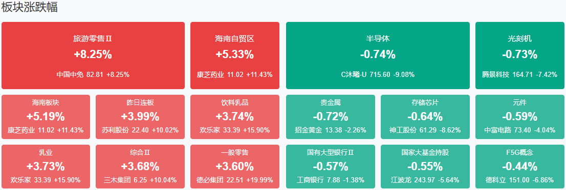 板块方面,海南、乳业、零售等板块涨幅居前,贵金属、半导体等板块跌幅居前。截至收盘,沪指涨0.36%,深成指涨0.66%,创业板指涨0.49%。
