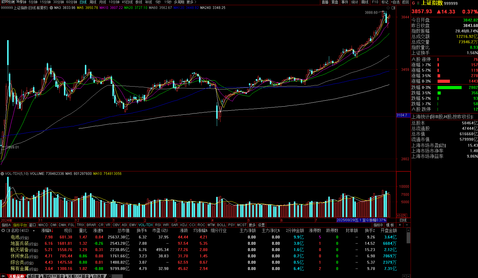 三大指数冲高震荡,其中沪指涨0.37%,深成指涨0.99%,创业板指涨2.23%。总体个股跌多涨少,下跌家数达3309家,涨停家数(排除ST)为63家,跌停家数(排除ST)为9家,市场情绪再度回落。两市成交额总计2.79万亿,较昨日缩量1725亿,成交量维持高水平
