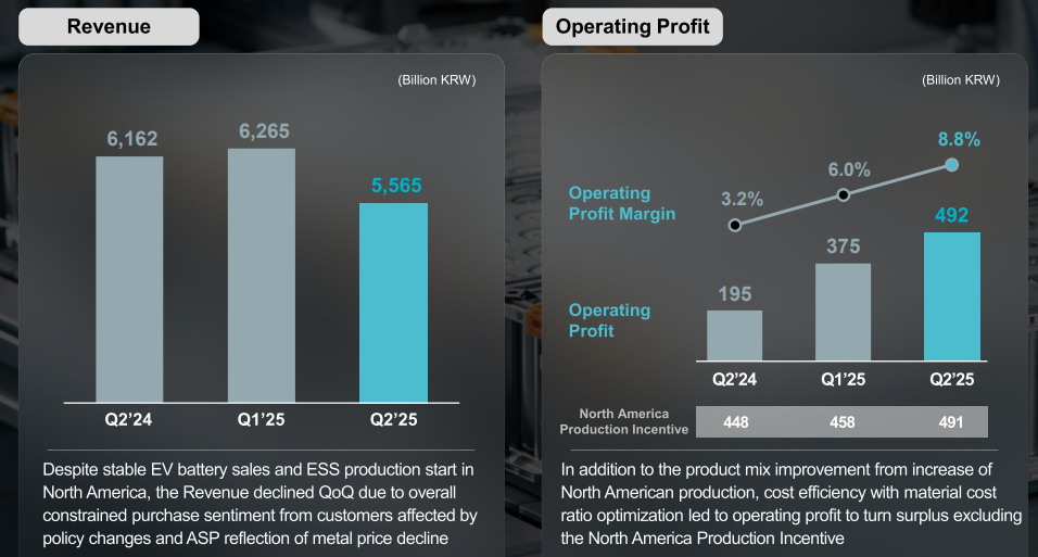 事件:LG Energy Solution披露二季度财报,公司上半年营收为5.6万亿韩元(291.2亿元人民币),环比减少11.2%,同比减少9.8%。2025年二季度,公司营业利润为4922亿韩元(25.59亿元人民币),环比增长31.4%,同比增长152.3%,营业利润率为8.8%;净利润为910亿韩元,环比减少59.9%,同比扭亏为盈。