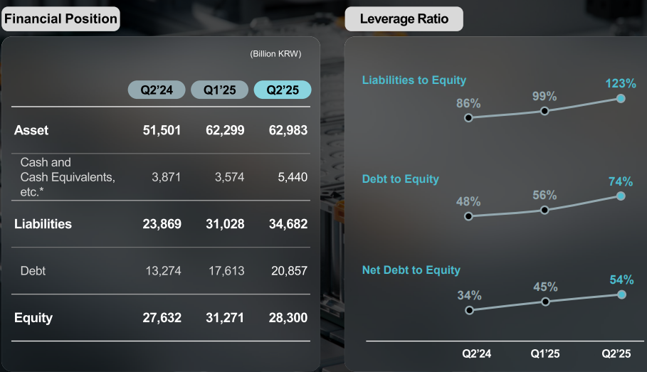 截至2025年二季度末,公司持有的现金及现金等价物为5.44万亿韩元,环比增长52.2%,同比增长40.5%。2025年二季度末,公司债务总额为20.86万亿韩元,环比增加18.4%,同比增加57.1%。