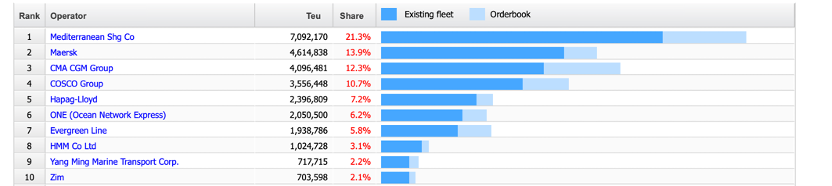 根据Alphaliner今日数据,目前全球班轮公司运力排行中,最高的为MSC地中海航运,共有运力709.21万TEU,占市场份额21.3%。中远海运集团排名第四,运力约355.65万TEU。