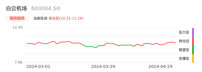 我们来看一下该股的九方特色指标强弱趋势的情况:白云机场自04月17日从观望区上穿到持仓区。股价近期在多头区域回调整理。后续重点关注多空分界点的争夺:10.31元。如未能有效站稳则可能重新回到空头行情。