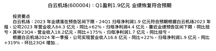 值得注意的是:2024年04月浙商证券的李丹/李逸分析师,首次发布关于白云机场的研究报告,标题为:白云机场(600004):Q1盈利1.9亿元 业绩恢复符合预期。