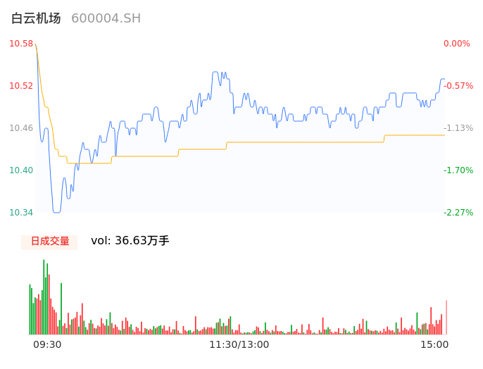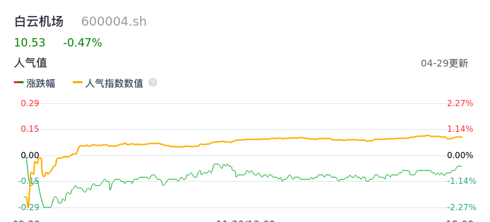 04月29日,白云机场收报10.53,股价涨幅-0.47%,成交金额3.83亿元,换手率1.55%。