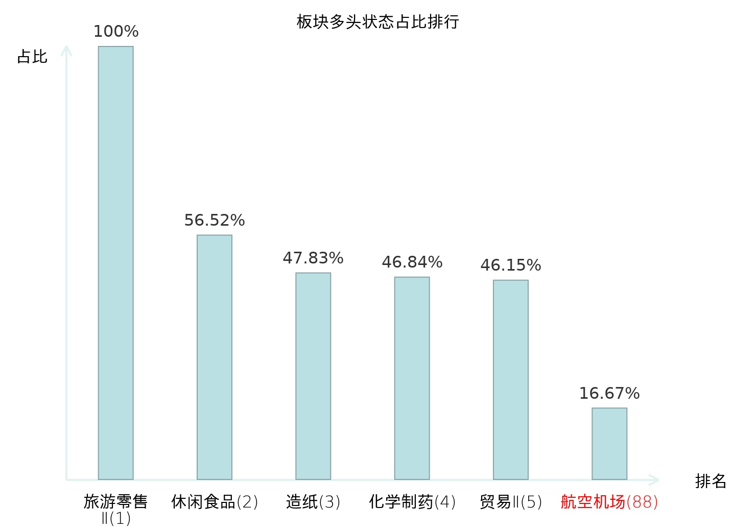 全市场所有行业板块中主力多头状态占比排名中,旅游零售Ⅱ板块位居第一。动物保健Ⅱ板块名次提升最快,较昨日上升58位。