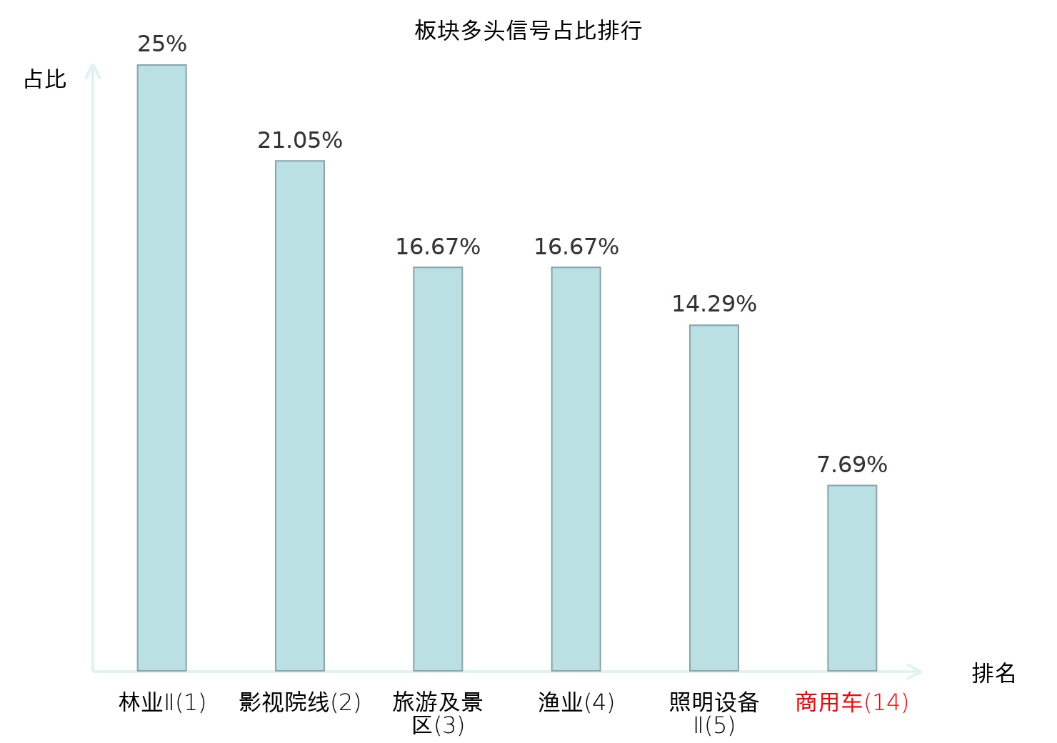 全市场所有行业板块中主力多头信号占比排名中,林业Ⅱ板块位居第一。林业Ⅱ板块名次提升最快,较昨日上升124位。