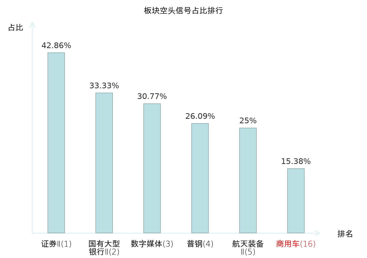 全市场所有行业板块中主力空头信号占比排名中,证券Ⅱ板块位居第一。证券Ⅱ板块名次提升最快,较昨日上升127位。