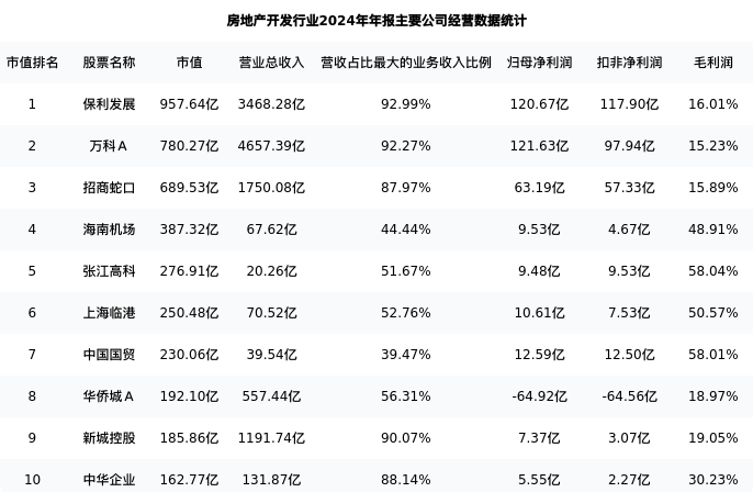 中国国贸最新报告期数据为年报,下表汇总了房地产开发行业内市值靠前的公司年报主要经营数据