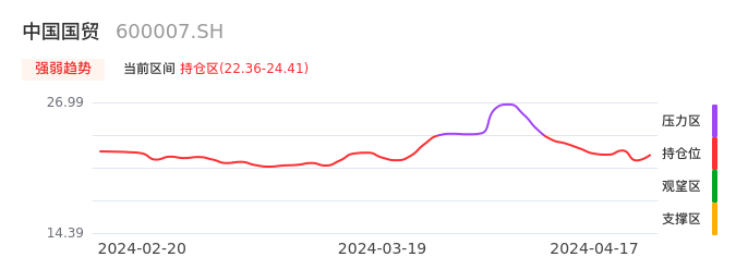 我们来看一下该股的九方特色指标强弱趋势的情况:中国国贸自04月08日从压力区回到持仓区。股价在持仓区盘整一段时间后,目前有启稳迹象。后续重点关注上方压力位:24.41元是否能重新上攻。