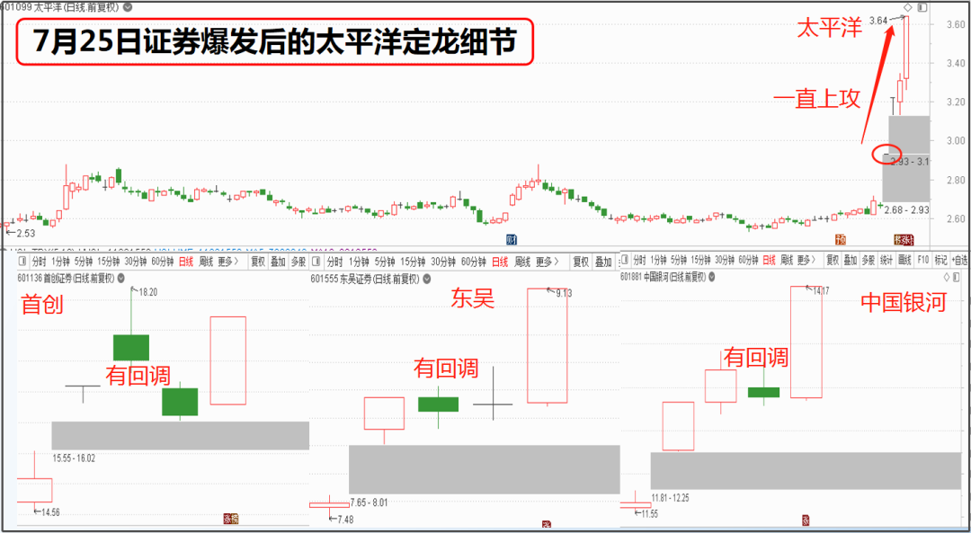 太平洋一字板涨停时板块内有4个个股(首创、东吴、中国银行)跟着涨停,但当时还未能定太平洋为龙头。