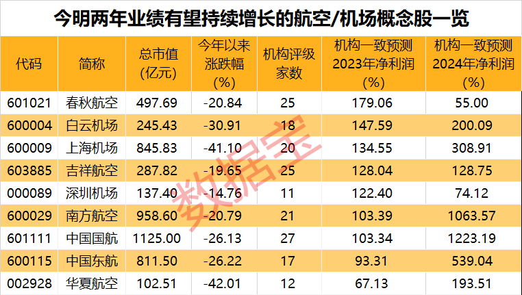 2024年业绩方面,机构一致预测中国国航、南方航空、中国东航、上海机场等7股的业绩有望翻倍增长。