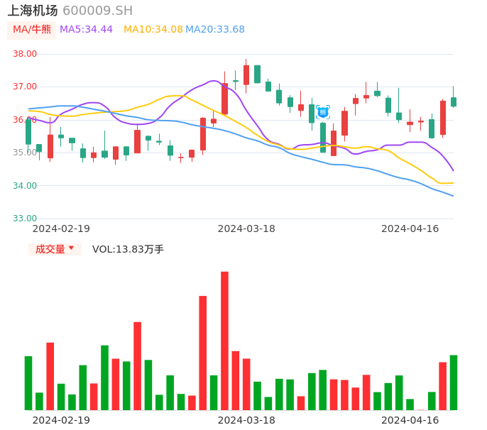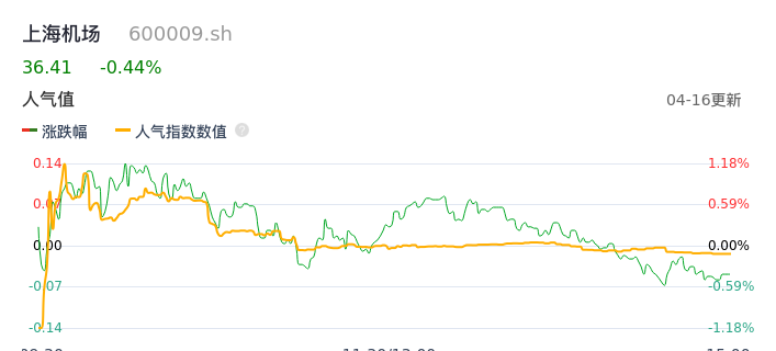 04月16日,上海机场收报36.41,股价涨幅-0.44%,成交金额5.08亿元,换手率0.72%。