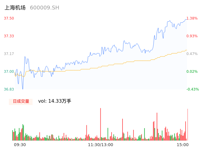 04月26日,上海机场收报37.50,股价涨幅1.38%,成交金额5.33亿元,换手率0.74%。