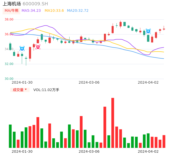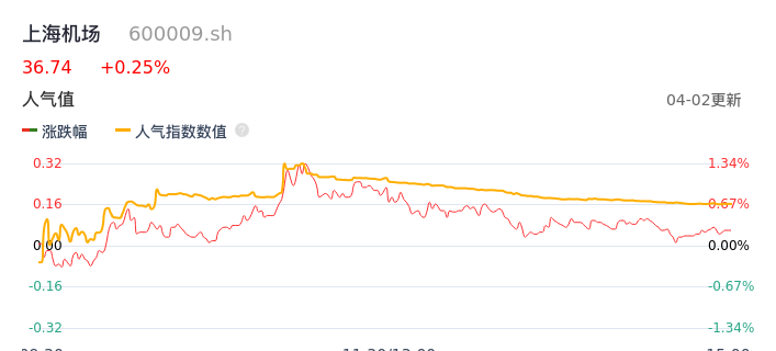 04月02日,上海机场收报36.74,股价涨幅0.25%,成交金额4.06亿元,换手率0.57%。
