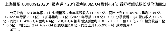 值得注意的是:2024年04月华创证券的分析师,首次发布关于上海机场的研究报告,标题为:上海机场(600009)2023年报点评:23年盈利9.3亿 Q4盈利4.4亿 看好枢纽机场长期价值回归。