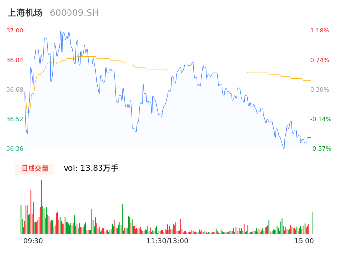 04月16日,上海机场收报36.41,股价涨幅-0.44%,成交金额5.08亿元,换手率0.72%。