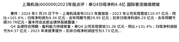 值得注意的是:2024年04月东吴证券的分析师,首次发布关于上海机场的研究报告,标题为:上海机场(600009)2023年报点评:单Q4归母净利4.4亿 国际客流继续爬坡。
