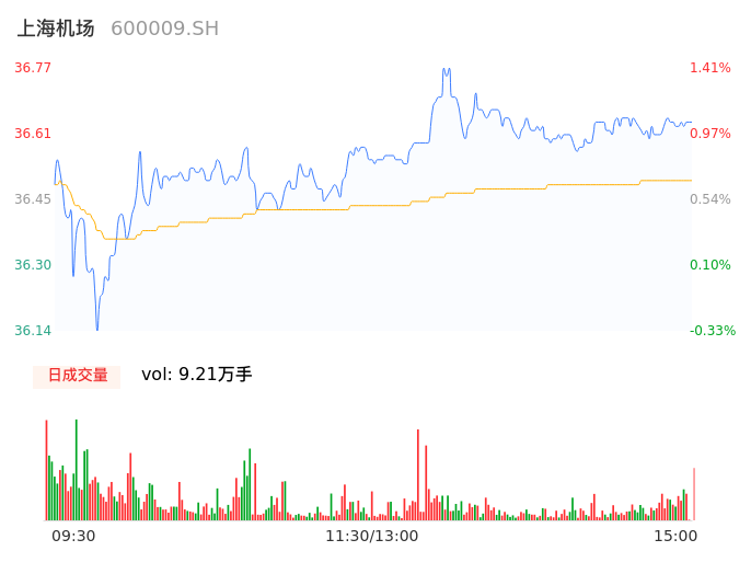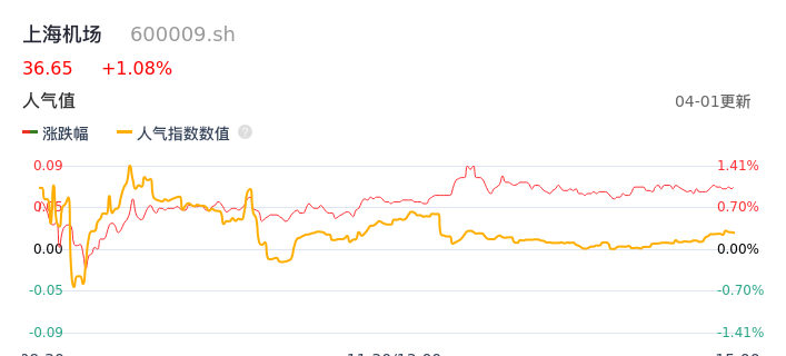 04月01日,上海机场收报36.65,股价涨幅1.08%,成交金额3.36亿元,换手率0.48%。