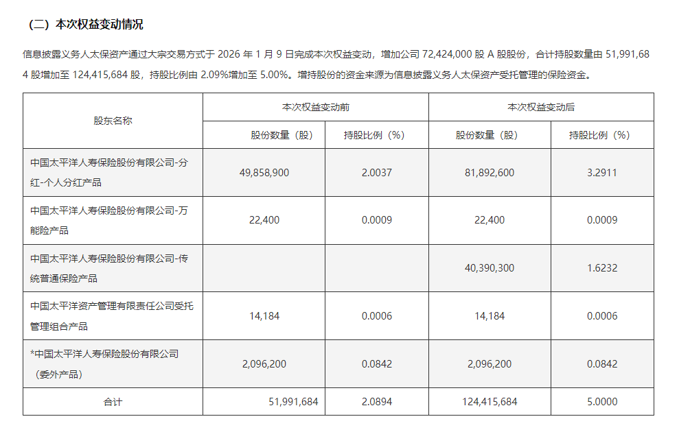 近日,上海机场发布公告称,太保资产通过大宗交易方式于2026年1月9日完成权益变动,增加该公司约7242万股A股股份,合计持股数量从约5199万股增加至1.24亿股,持股比例由2.09%增加至5.00%,增持股份的资金来源为太保资产受托管理的保险资金。