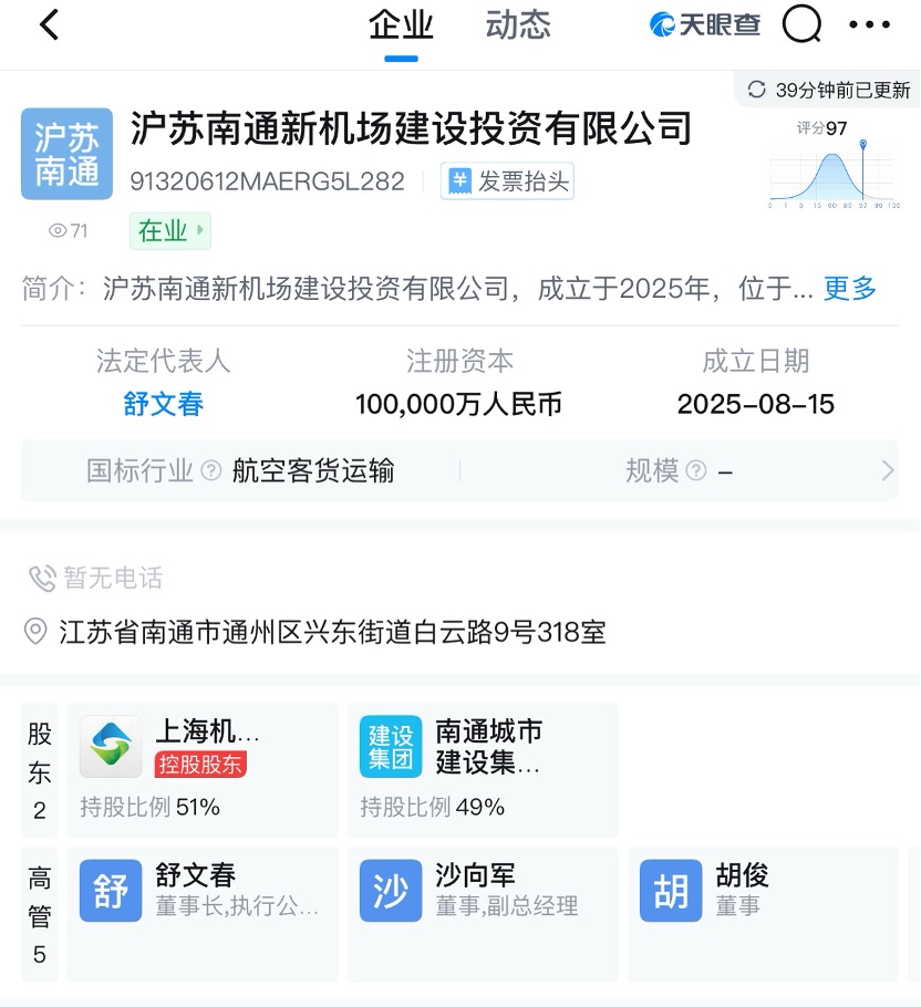 从天眼查App显示的最新信息来看,双方8月15日成立的合资公司,为沪苏南通新机场建设投资有限公司,注册资本10亿元,经营范围包含:民用机场运营;公共航空运输;建设工程施工;民用航空器维修;通用航空服务等。双方持股比例与此前公布的信息一致。