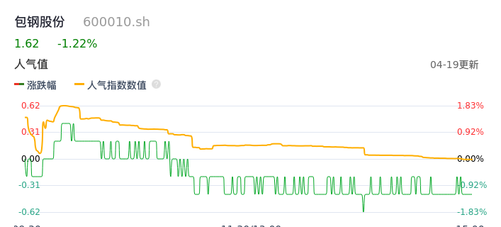 04月19日,包钢股份收报1.62,股价涨幅-1.22%,成交金额4.51亿元,换手率0.88%。