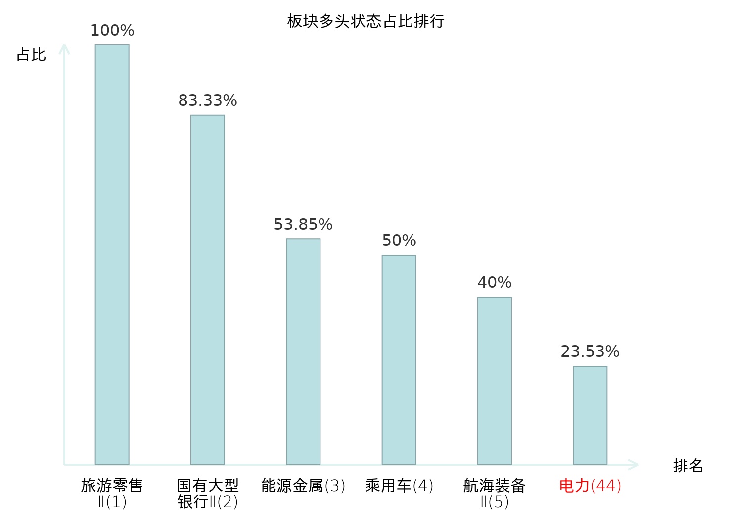 全市场所有行业板块中主力多头状态占比排名中,旅游零售Ⅱ板块位居第一。乘用车板块名次提升最快,较昨日上升121位。
